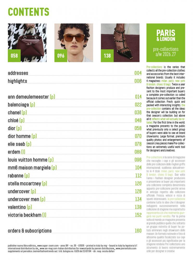 Scopri in anteprima le tendenze della stagione Autumn Winter 2026-27 con il nuovo volume di Precollections Paris & London. Questo numero esclusivo raccoglie il meglio delle sfilate Resort e Cruise, offrendo uno sguardo privilegiato sulle creazioni dei designer più influenti al mondo.
